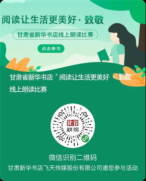 讀者進(jìn)入“甘肅新華書店飛天傳媒”公眾號點擊“新華朗讀”進(jìn)入小程序后,點擊頂部的“閱讀讓生活更美好?致敬”活動圖,進(jìn)入活動專區(qū),即可參加朗讀。