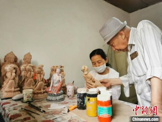 圖為敦煌彩塑非物質(zhì)文化傳承人魯勤學(xué)教授女兒上色技巧?!¢Z姣 攝