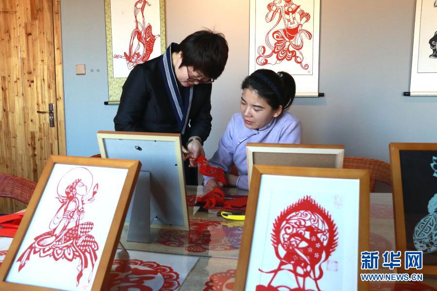 在甘肅敦煌小鎮(zhèn)鳴沙書院,“敦煌剪紙”酒泉市級(jí)非物質(zhì)文化遺產(chǎn)代表性傳承人莊生娟(左)在自己的工作室內(nèi)指導(dǎo)學(xué)員剪紙(2020年12月31日攝)。新華社發(fā)(張曉亮 攝)