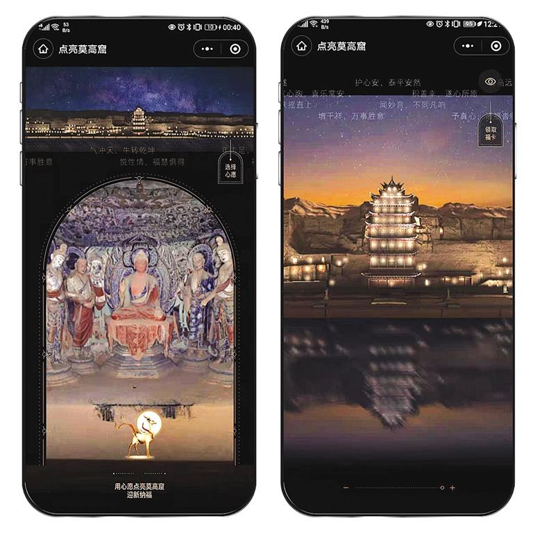 為了感受千年前莫高窟的燃燈民俗,記者迫不及待地體驗了一把:進入“云游敦煌”官方小程序,通過“點亮莫高窟”入口,即可欣賞星空下的莫高窟全景,并與萬千用戶一起“點亮”崖體上的洞窟。隨著用戶點亮人次增多,畫面中燈光的亮度也隨之增加。至深夜時分,用戶將會看到莫高窟崖體上空“銀河”與洞窟光亮相映成輝的景象,體驗千年前莫高窟燃燈盛況。“點亮莫高窟”的創(chuàng)意來自于敦煌文獻中記載的場景,莫高窟燃燈是敦煌歲時民俗。據(jù)記載,每逢特定的時間,當?shù)孛癖姇谀呖吲e行盛大的燃燈活動,于窟龕點亮燈盞。總燈數(shù)可高達700余盞。
