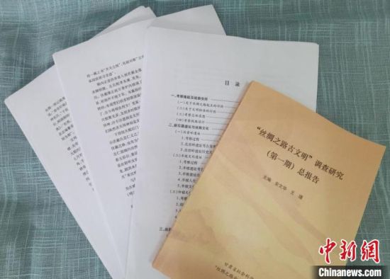 7月下旬,甘肅省社會(huì)科學(xué)院工作人員展示《絲綢之路古文明》第一階段考察報(bào)告打印版。 閆姣 攝