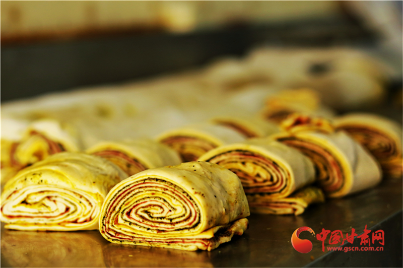 將放好佐料的層層面餅拉扯,卷成筒狀。
