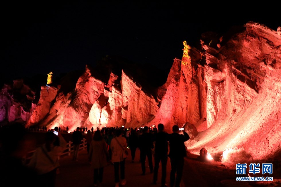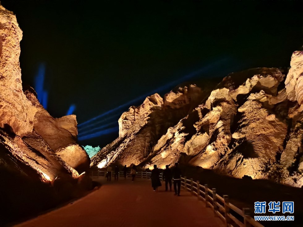 張掖七彩丹霞景區(qū)萬象土林谷華燈閃爍。新華網(wǎng)發(fā)(童張偉 攝)