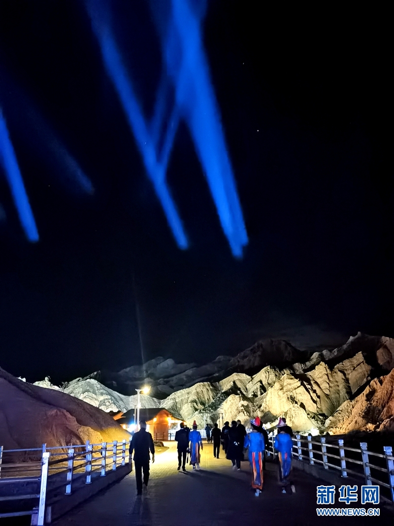 七彩丹霞與燈光秀融合,呈現(xiàn)了一場精彩紛呈的視覺盛宴。新華網(wǎng)發(fā)(王生元 攝)
