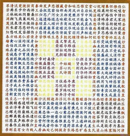 蘇蕙《璇璣圖》不僅是一束厚重的文學(xué)奇葩,也是一幅充滿創(chuàng)意的藝術(shù)巨制。她將詩歌的載體從傳統(tǒng)簡(jiǎn)帛紙張轉(zhuǎn)換成為錦。錦是有彩色花紋的高級(jí)絲織品。以錦為書寫材料制作《璇璣圖》,除詩歌本身的創(chuàng)作外,首先需要染絲紡織。錦織好后,又要對(duì)《璇璣圖》謀篇布局,劃區(qū)設(shè)色,書詩于錦,然后一針一針地將它繡出來,變?yōu)榛匚腻\字。那每一道工序,要求都極精細(xì),不得有半點(diǎn)疏忽,不然就會(huì)留下污點(diǎn)和遺憾。蘇蕙集眾藝于一身,完美地將其制作出來,體現(xiàn)了她的綜合藝術(shù)才能。取名“璇璣(泛指北斗)圖”,寓意它像北斗,可以旋轉(zhuǎn)地讀。它是在華美的錦上,又以五彩繽紛的絲線繡上《璇璣圖》,不僅顏色更加艷麗,而且那841個(gè)金玉珠璣般文字,展現(xiàn)的令人眼花繚亂的詩歌園地,更是前不見古人,后不見來者,比錦繡的光彩更加耀眼奪目。