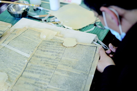 古籍部主任李東暉介紹,古籍破損的原因很多,歸納起來大致有蟲蛀鼠嚙、霉蝕、酸化、老化、使用中的磨損等。針對不同的“病因”,古籍修復(fù)師都要制訂不同的修補(bǔ)方案。古籍修復(fù)有兩種方法,一種是全手工修復(fù),另一種是使用紙漿補(bǔ)孔設(shè)備修復(fù)。全手工修復(fù)需要選擇配紙、修補(bǔ)破洞、壓平處理、搓紙捻釘、理齊、打眼、復(fù)原裝訂成冊等工序。紙漿補(bǔ)孔機(jī)修復(fù)一般適用于蟲蛀破損嚴(yán)重的古籍。面對一些破損嚴(yán)重的古籍,將粘連的古籍分頁也絕非易事,得使用“干揭”“濕揭”“蒸揭”等手法。