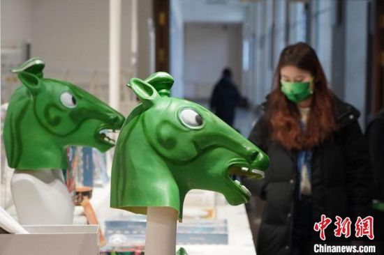 圖為“神馬來了”銅奔馬頭套吸引參觀者駐足?!【琶赖┰?nbsp;攝