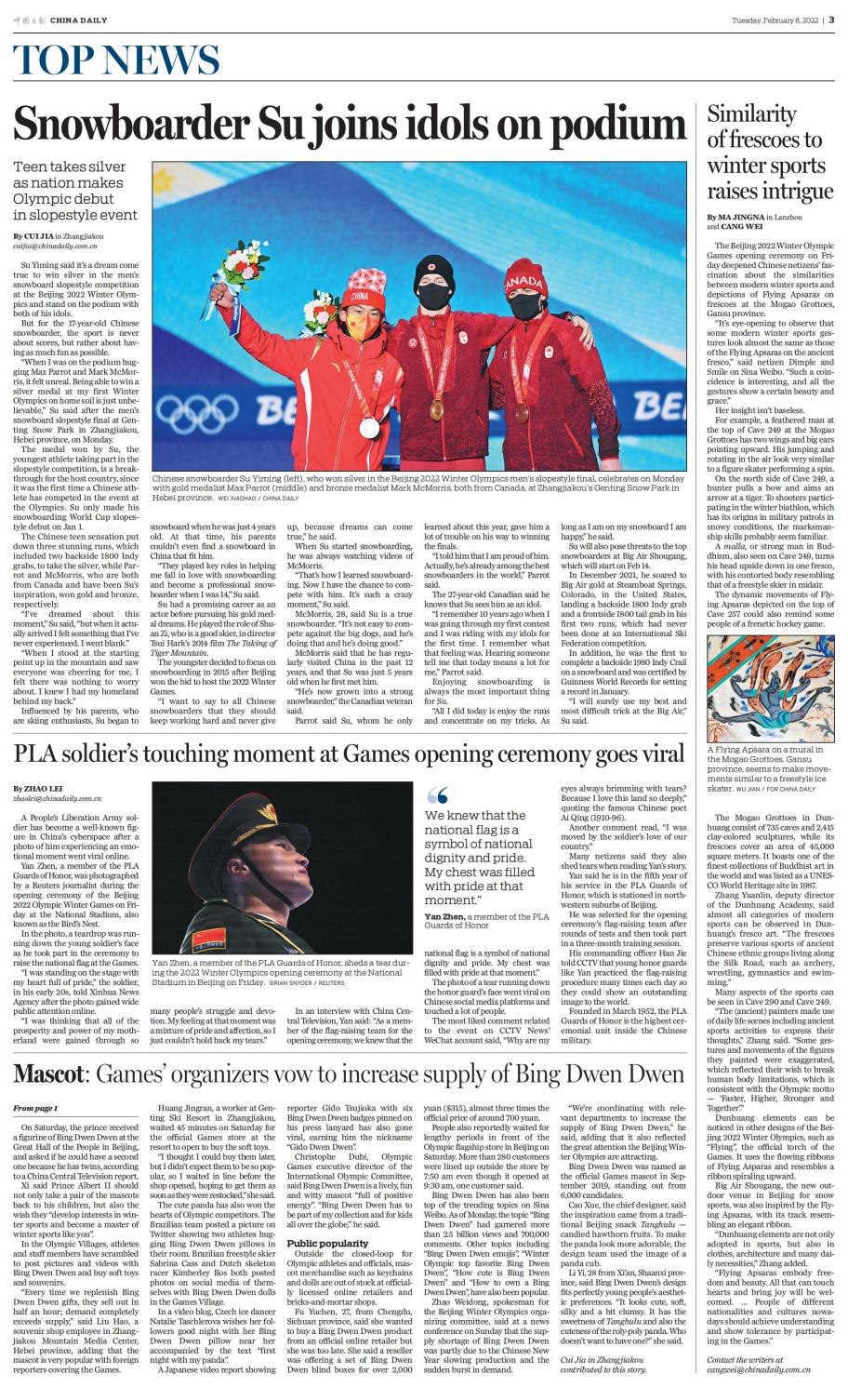 《中國日報》2月8日三版,對敦煌莫高窟壁畫與冬季運(yùn)動的相似性進(jìn)行了報道。