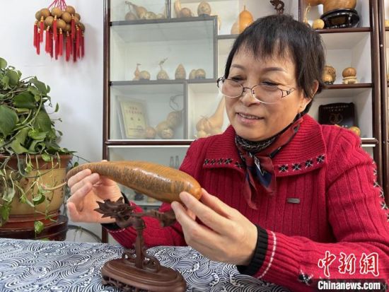 2月15日,蘭州市非遺傳承人陳兵在工作室展示自己雕刻的微雕作品,她擅長在雞蛋大小的葫蘆上雕刻敦煌壁畫、敦煌飛天,以及佛教經(jīng)文,一把刻刀上下翻飛之后,雕刻形象神態(tài)逼真。