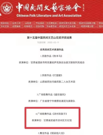 中國甘肅網(wǎng)3月14日訊(本網(wǎng)記者 張振國)近日,第十五屆中國民間文藝山花獎(jiǎng)評(píng)獎(jiǎng)結(jié)果公示,由武威市舞蹈家協(xié)會(huì)副主席付泓創(chuàng)作、武威市涼州區(qū)文化館表演的作品《涼州攻鼓子》榮膺該獎(jiǎng)。該獎(jiǎng)項(xiàng)的獲得,是武威市文藝創(chuàng)作和非遺保護(hù)傳承的又一優(yōu)秀成果。