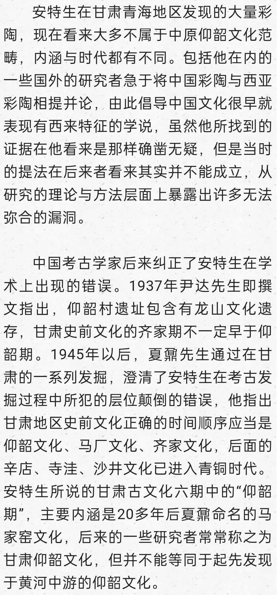安特生從1923年開始沿黃河西行,去追溯仰韶文化和彩陶文化的源頭。他在甘肅和青海一帶發(fā)現(xiàn)了豐富的古文化遺存,發(fā)現(xiàn)了比中原數(shù)量更多的彩陶,這使得他流連忘返,一直在那里待了近兩個年頭。安特生發(fā)現(xiàn)六種考古學(xué)文化中都見到了彩陶,他認(rèn)為這些考古學(xué)文化處于新石器時代晚期到向青銅時代過渡的時期,絕對年代約在公元前3500年到1500年之間,包括仰韶在內(nèi)它們代表了6個發(fā)展階段,它們是齊家期、仰韶期、馬廠期、辛店期、寺洼期和沙井期,這便是他創(chuàng)建的“六期說”。將齊家期放在仰韶期之前,齊家期簡單而質(zhì)樸的彩陶紋飾,被認(rèn)定是彩陶開始出現(xiàn)的證據(jù)。