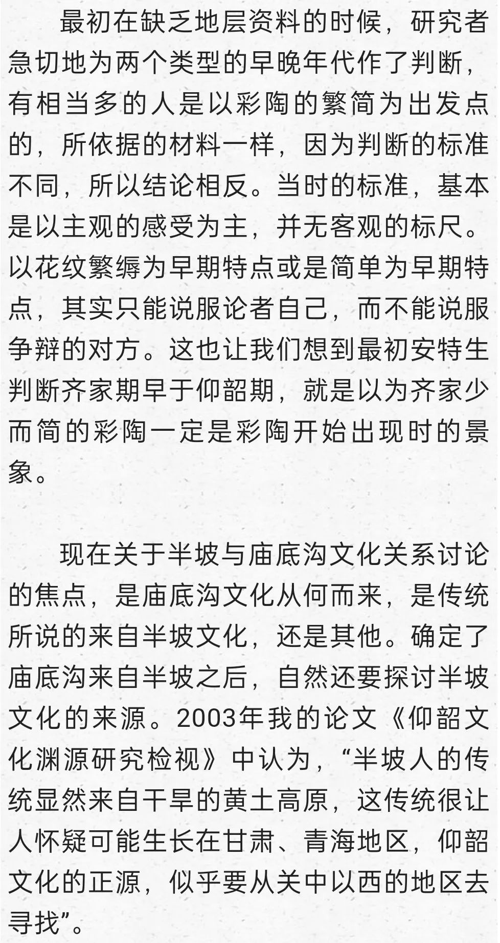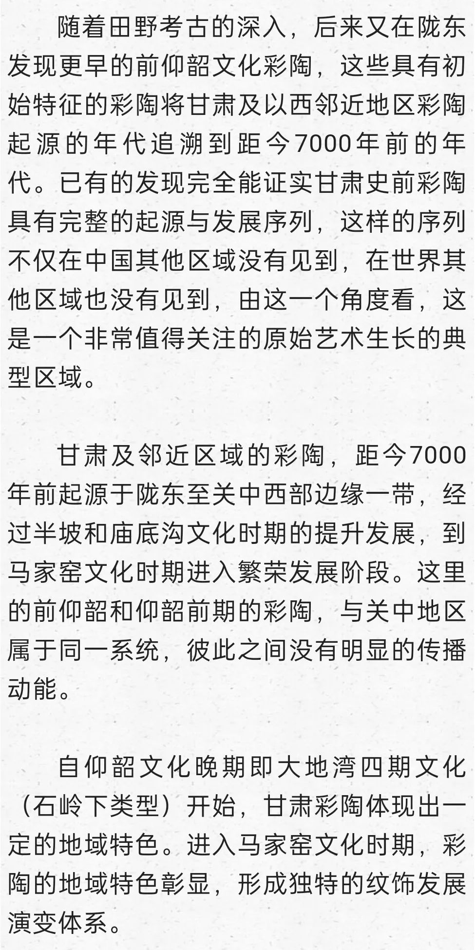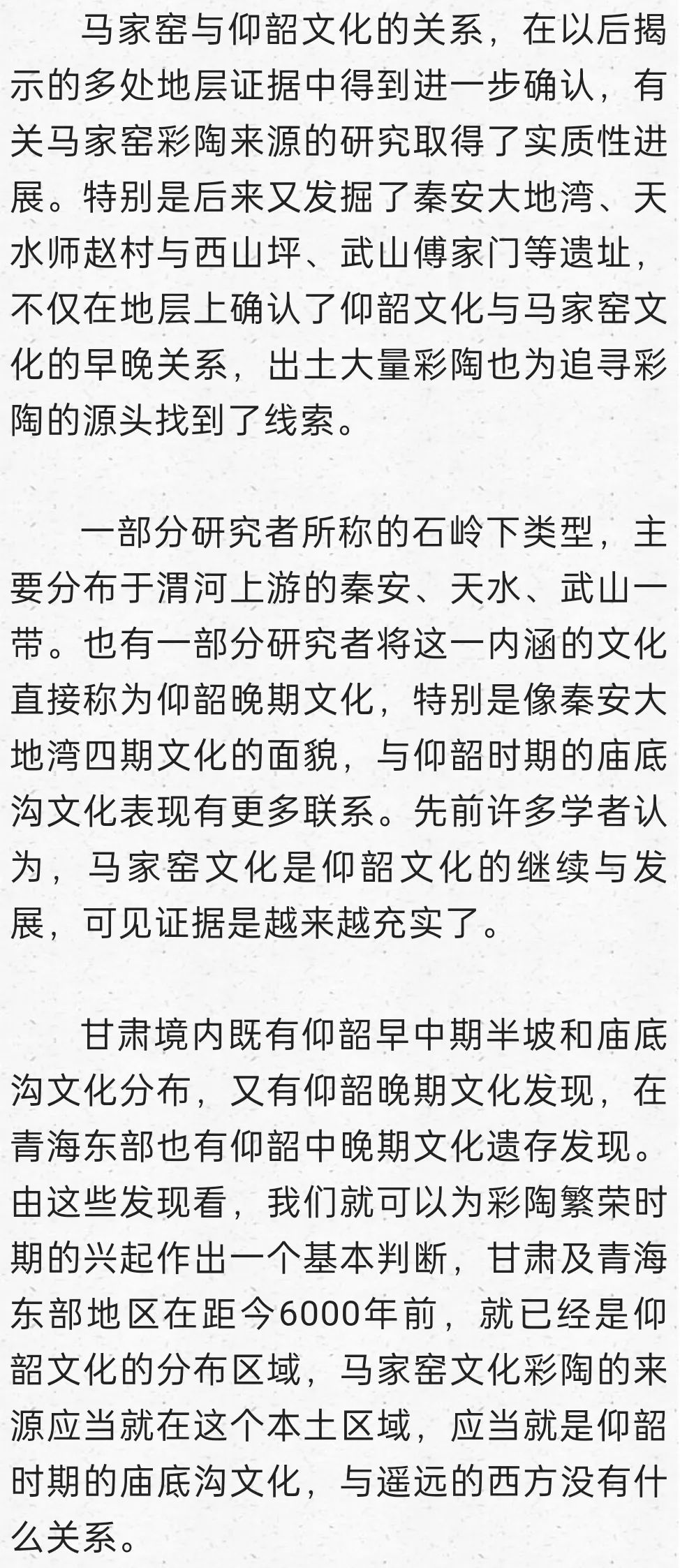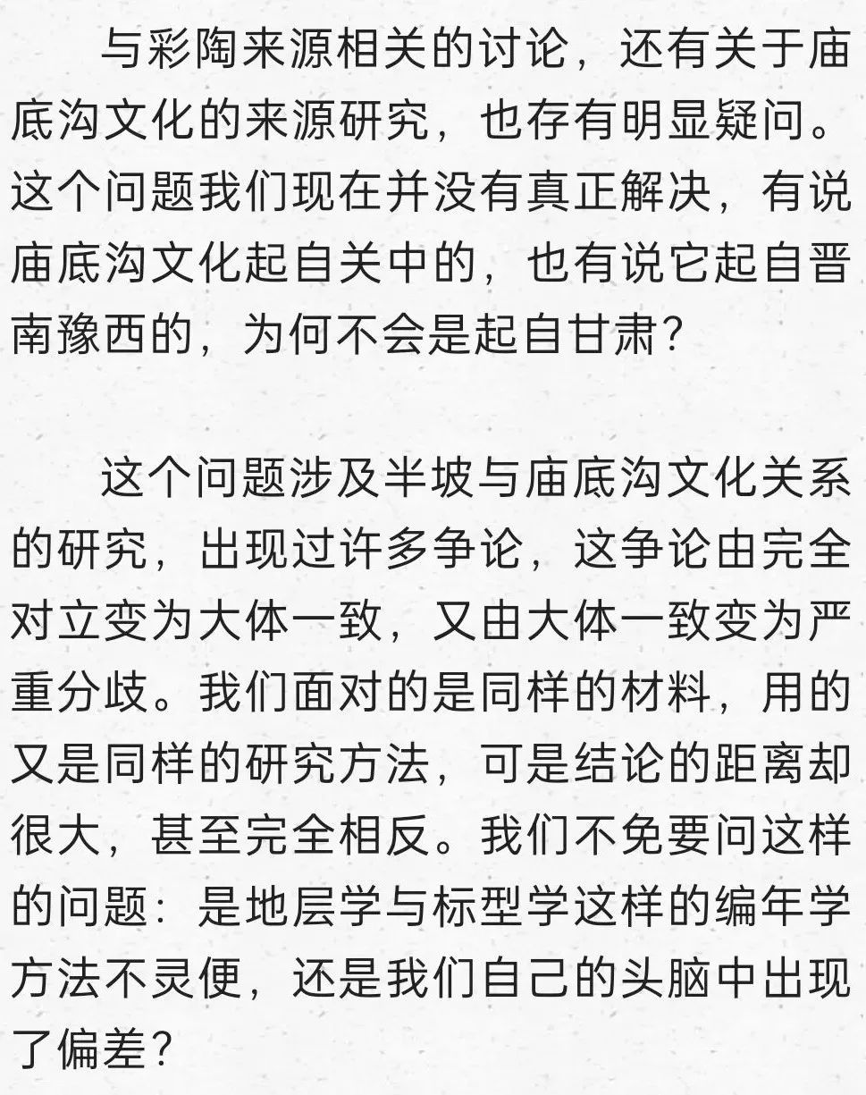 在這里明確提出到甘青尋找仰韶文化的正源,后來我又寫成《秦安大地灣遺址彩陶研究》,討論甘青彩陶的序列,也表達(dá)了類似觀點:“甘肅及青海東部地區(qū)在距今6000年前左右,就已經(jīng)是仰韶文化的分布區(qū)域,馬家窯文化彩陶的來源應(yīng)當(dāng)就在這個本土區(qū)域,應(yīng)當(dāng)就是仰韶時期的廟底溝文化。從文化的分布與地層堆積關(guān)系找到了甘肅地區(qū)考古學(xué)文化明確的傳承關(guān)系,由彩陶紋飾演變的考察也能尋找到傳承的脈絡(luò)”。