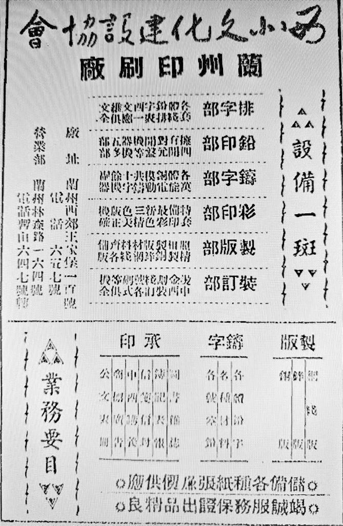 個別有實力的印刷廠也通過廣告拓展業(yè)務(wù)。如創(chuàng)辦于1947年9月的西北文化建設(shè)協(xié)會蘭州印刷廠是當(dāng)時甘肅規(guī)模較大的印刷廠之一,曾印制過《蘭州古今注》《花兒集》《西北論叢》《新光》等書刊。據(jù)當(dāng)年廣告所載,該廠內(nèi)設(shè)排字部、鉛印部、鑄字部、彩印部、制版部、裝訂部,承印范圍亦頗廣,包括圖書雜志、傳記表報、信箋信封、中西講義、商標(biāo)廣告、公文表格等。