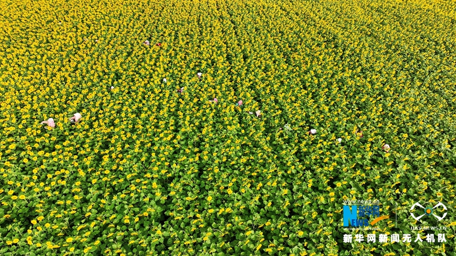 7月23日,甘肅省張掖市臨澤縣新華鎮(zhèn)長莊村近千畝制種向日葵盛開,金色花海里數(shù)十名葵農(nóng)忙著為向日葵授粉。新華網(wǎng)發(fā)(成林 攝)