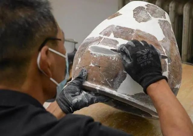 文物工作者對南佐遺址內出土的陶器進行修復(8月25日攝)。新華社記者 李賀