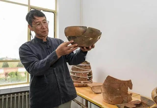 南佐遺址聯(lián)合考古隊領隊、中國人民大學歷史學院考古文博系教授韓建業(yè)在遺址研究基地內展示出土的陶器(8月23日攝)。新華社記者 李賀 攝