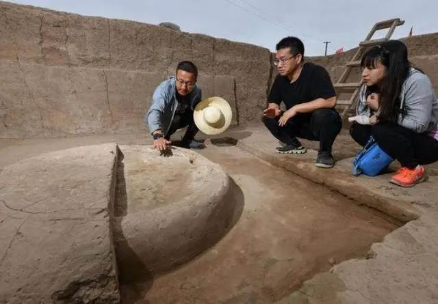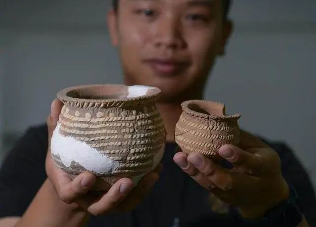 考古工作人員在展示遺址內出土的箍白泥附加堆紋夾砂陶罐(8月25日攝)。新華社記者 李賀 攝