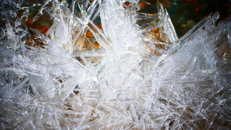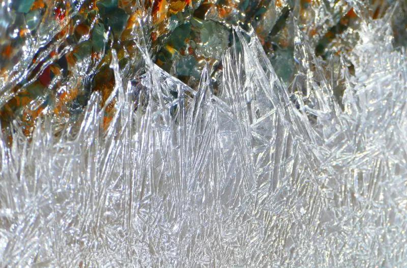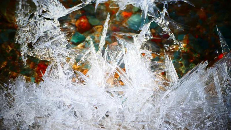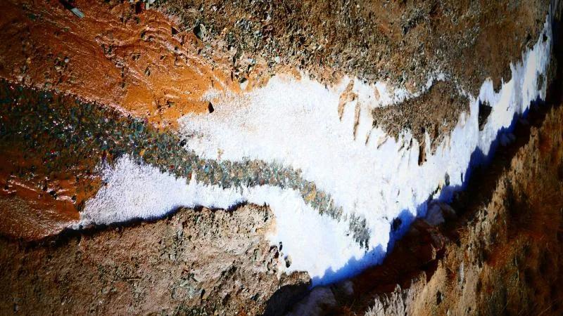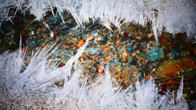 在丹霞山間可見一條冰凍似凍的水溪,系小泉河支流,在陽光下透過像東北冬天窗花一樣的冰花,可看見水下的鵝卵彩石,望遠(yuǎn)看去小溪像一條披上雪衣的彩龍。