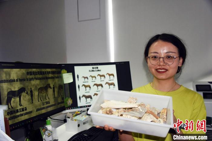 馬姣在辦公室展示介紹用于本次研究的部分馬化石樣品。 中新社記者 孫自法 攝