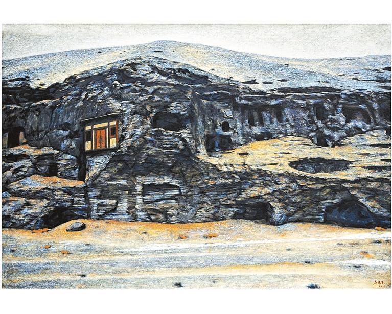 房建平多年來扎根甘肅、扎根西北,深受敦煌藝術的影響,并由此產(chǎn)生了自己獨到的見解。他以當下的視角去審視千年之前的敦煌壁畫,思考古代工匠創(chuàng)作的技法運用以及時代所賦予工匠們的精神面貌。他在深入研究敦煌壁畫的過程中,被那豐富的色彩所吸引,被那厚重斑駁的肌理所嘆服,被那點線面的旋律所震撼。他孜孜不倦、廢寢忘食地學習,吸收借鑒敦煌壁畫的元素,然而并非簡單地臨摹、復制與再現(xiàn),而是于審視、思索之后源源不斷地發(fā)現(xiàn)、感受、弘揚。更為可貴的是,他竭力探尋敦煌莫高窟的精神內(nèi)涵,包括開放包容多元文化一體的精神、莫高窟守護人的工匠精神的共同凝聚。