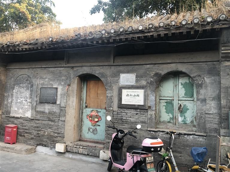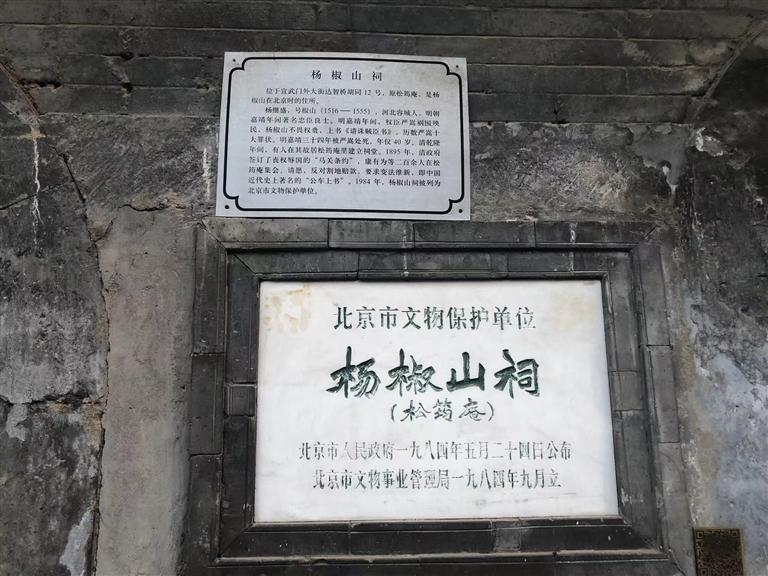 就是在這個(gè)胡同里,我看到一個(gè)歇山式屋頂?shù)姆课荩严喈?dāng)?shù)钠茢?,屋頂上長滿了凄凄荒草,門窗皆已破爛不堪。但是門旁的墻壁上卻鑲嵌著一塊匾,近前一看,上面寫著“楊椒山祠”。喲,這就是楊椒山在北京的祠。