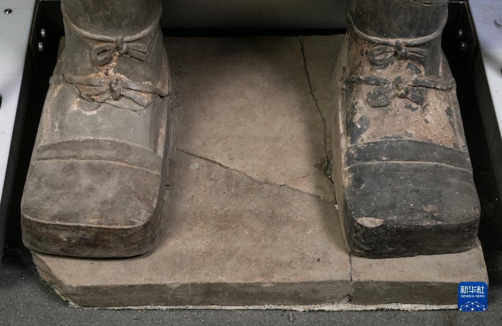 在秦始皇帝陵博物院文物保護(hù)部彩色陶俑修復(fù)室內(nèi),一尊秦俑的雙腳被工匠塑造出細(xì)節(jié)(8月23日攝)。