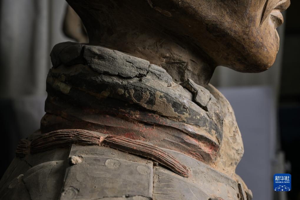 在秦始皇帝陵博物院文物保護(hù)部彩色陶俑修復(fù)室內(nèi),一尊秦俑衣領(lǐng)處的彩繪顏料層依稀可辨(8月23日攝)。