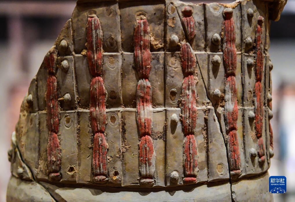 一尊出土的彩繪秦俑鎧甲殘塊在首都博物館展出(2021年5月18日攝)。