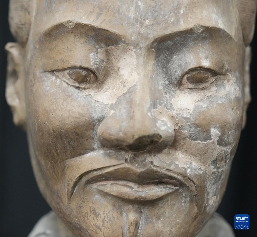在秦始皇帝陵博物院文物保護(hù)部彩色陶俑修復(fù)室內(nèi),一尊秦俑臉部尚存部分彩繪層。秦俑五官的精準(zhǔn)塑造顯示出秦代匠人具有高超的寫實能力(8月23日攝)。