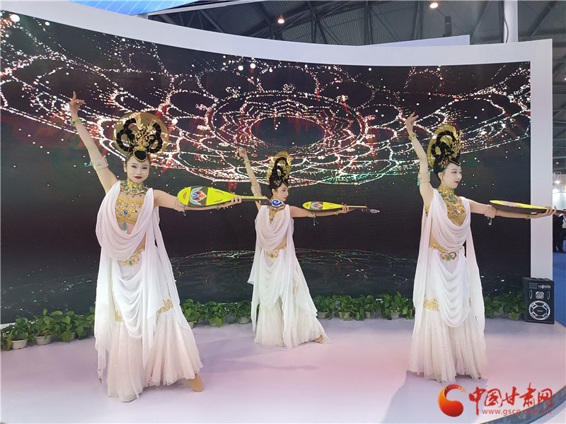 走進(jìn)甘肅特色版權(quán)館,敦煌文化元素濃郁。無論是展廳頂部的三兔共耳藻井,還是數(shù)字敦煌展區(qū)顯眼現(xiàn)代的四個(gè)大字,都在展示甘肅的敦煌元素。而展廳舞臺區(qū)更是以數(shù)字敦煌庫為背景,由舞蹈演員現(xiàn)場表演《妙音反彈》,讓觀眾走進(jìn)甘肅館,就能發(fā)現(xiàn)敦煌韻。