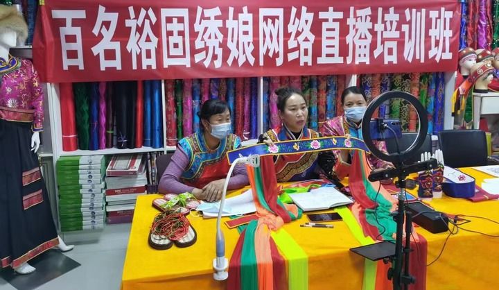 2021年11月,獲得甘肅省鄉(xiāng)村工匠名師稱號(hào)的潘小紅(中)帶領(lǐng)姐妹通過網(wǎng)絡(luò)直播幫助更多人學(xué)習(xí)刺繡技巧。新華社發(fā)(佘萬青攝)