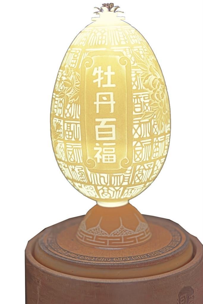 楊星國雕刻過的作品達兩千多件,作品《牡丹亭》是他用最新的拼雕手法創(chuàng)作的,鴕鳥蛋殼細分成300片,打磨成“瓦片”樣,逐片貼成古建筑中亭頂蓋狀,形成牡丹亭之樣,做成外層的“亭”;內(nèi)層的“牡丹”則用鴯鹋蛋殼,利用其自然色,依照牡丹層層雕透,第一層深墨、第二層墨綠、第三層淡綠、第四層白色從外到內(nèi)雕刻,作品既有國畫的神韻又有雕刻的立體藝術(shù)之美。浮雕、陰雕、陽雕、鏤空雕、拼雕等手法,在《牡丹亭》作品里全部顯現(xiàn)。為了讓作品表達的效果更充分,楊星國又加了一些機械原理讓其旋轉(zhuǎn),還加了燈光,于是,3個鴕鳥蛋殼與1個鴯鹋蛋殼在楊星國的巧妙構(gòu)思中有了全新的生命。