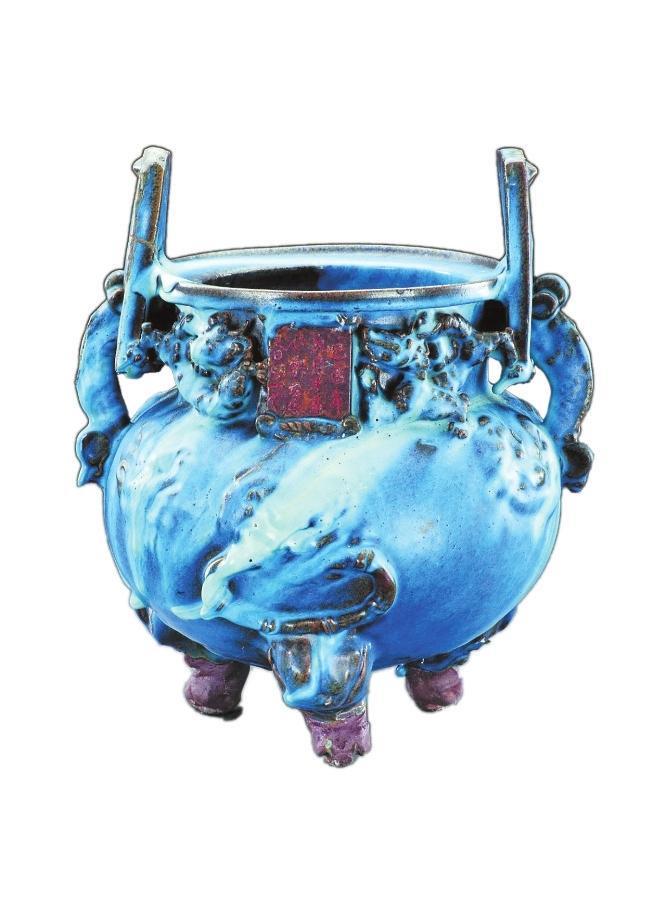 香爐整體造型為雙立耳,圓鼓腹,三獸足,體形較大。頸部雕貼三只麒麟,正面有一初方形題記,刻有“己酉年九月十五小宋自造香爐一個”共計15字,經(jīng)考證:“己酉年”是公元1309年,屬于元代中期。香爐通體施天青色釉,釉層較厚,在高溫中由于積釉濃淡不一,縱橫流淌到器表各處,形成天青、天藍(lán)、灰藍(lán)等不同釉面,再與紅褐色的露胎對比,有了銅器般的金屬質(zhì)感。