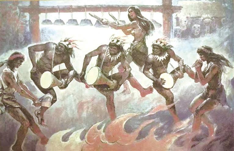 可以想見,在4000多年前的一個傍晚,先民們圍著篝火,系上繪有華麗紋飾的彩陶鼓,手拉手,和著呼喊的節(jié)奏,隨著歡快的鼓點唱著、跳著,來慶祝一天的收獲。