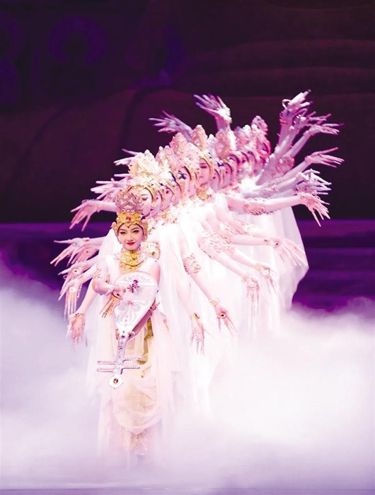 經典舞劇《絲路花雨》歷經45載,累計演出3952場,觀眾達537.47余萬人次,享有“中國民族舞劇的典范”“東方的《天鵝湖》”之稱。演出現(xiàn)場,劇中經典舞蹈選段《金光千佛》《反彈琵琶》《霓裳羽衣舞》《夢幻伎樂天》為游客粉絲和廣大觀眾繽紛綻放,引發(fā)陣陣歡呼。“反彈琵琶”源自莫高窟第112窟的反彈琵琶樂舞圖,“千手觀音”還原了莫高窟元代3窟中的千手千眼觀音圖,“活著的敦煌壁畫”、獨創(chuàng)的“S”形舞姿讓游客沉浸式感受絲路文化藝術的魅力。