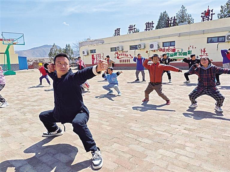 在晏家洼小學(xué),記者看到,山頂?shù)年柟馀c風(fēng)里,17個孩子整整齊齊地站在操場上,在陳偉禮的帶領(lǐng)下,有模有樣地練起來。弓步,出拳,眼神凌厲,撤腿,下蹲,身體下壓,此刻的孩子們像一只只努力展翅的雛鷹。