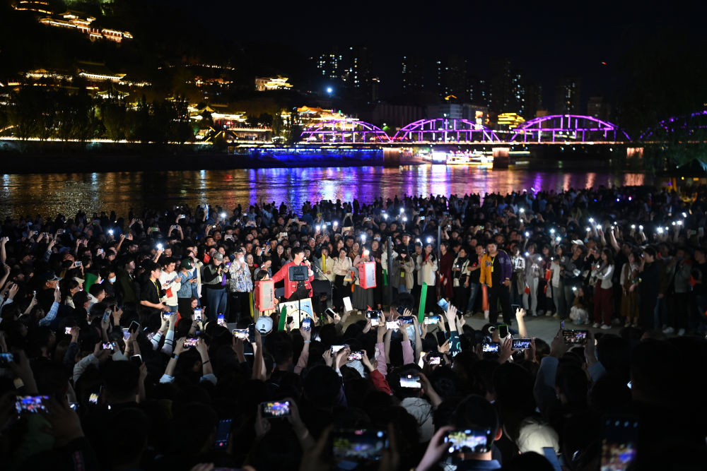 4月26日,游客在蘭州黃河食渡文旅美食街觀看演出。新華社記者 郎兵兵 攝