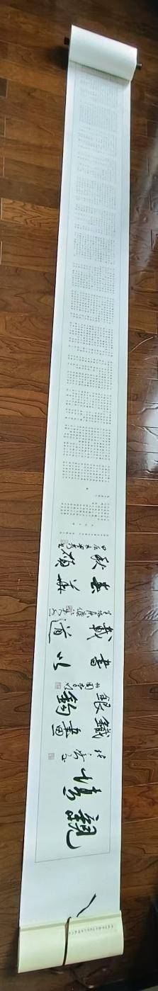 該長卷是白建新繼200米硬筆書法長卷《蛙》之后的又一部力作。作者耗時一年四個月,用硬筆楷書在四尺對開的宣紙上創(chuàng)作的《海峽兩岸著名作家系列 親情散文卷》,字體嚴謹,書風(fēng)純正,字形一厘米見方,盡顯歐楷風(fēng)體。全篇近30萬字,共分5卷,幅長達250米。