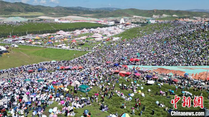 8月4日,人們?cè)诋?dāng)周草原觀看九色甘南香巴拉旅游藝術(shù)節(jié)開(kāi)幕式表演。當(dāng)日,第22屆九色甘南香巴拉旅游藝術(shù)節(jié)在甘肅省甘南藏族自治州當(dāng)周草原開(kāi)幕。人們身著節(jié)日盛裝載歌載舞、歡聚一堂,馬隊(duì)巡游、千人鍋莊舞等活動(dòng)精彩上演。九色甘南香巴拉旅游藝術(shù)節(jié)既是民眾浪山聚會(huì)的節(jié)日盛會(huì),也是展現(xiàn)發(fā)展成就、擴(kuò)大對(duì)外開(kāi)放的重要窗口,更是展示民俗文化、促進(jìn)廣泛交往交流交融的有效載體。(無(wú)人機(jī)照片)中新社記者 九美旦增 攝
