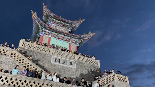 夕陽西下,夜色漸濃,三臺閣上游人如織,山下的萬家燈火隨著夕陽余暉的隱退漸漸蘇醒,一盞盞燈光次第亮起,璀璨如星海。人們紛紛舉起手機和相機,記錄下這一刻的美好。“真不愧是金城蘭州,站在這里俯瞰蘭州是什么神仙視角!”“終于知道夜晚的蘭州為啥被稱作‘蘭哈頓’了,回去好好跟朋友炫炫……”來自陜西的大學生小劉和他的小伙伴們一邊尋找拍照最佳角度,忍不住發(fā)出贊嘆。在這一刻,古老的閣樓與游客一起沉醉在蘭山的夏夜晚風中?!?/p>