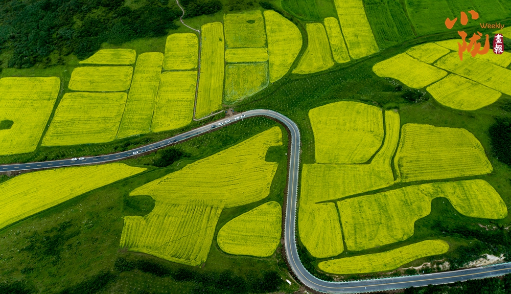 油菜花海遍布周圍的山坡,古哈公路穿境而過,駕車行駛在這條路上,古村、田野、山水不斷,欣賞著山村美景,一路盤旋,最是怡人自得。