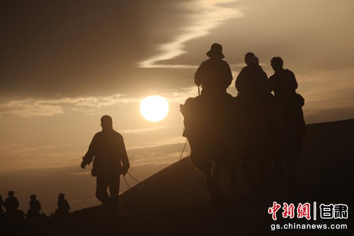 9月1日清晨,游客走進甘肅省敦煌市鳴沙山月牙泉景區(qū),乘騎駱駝欣賞大漠風光,體驗絲路風情。