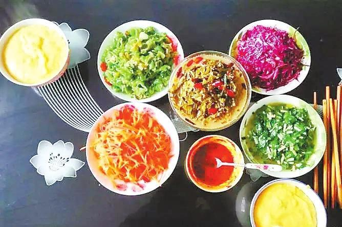 百人百心病,百人百口味?,F(xiàn)在的人吃馓飯,對菜品的要求越來越高了,除了酸菜,人們大多還會調一些涼菜,或炒一些菜,蘿卜的,肉丁的,山野菜的,虎皮辣子的,滿滿地擺上一桌子,如錦上添花,令人食欲大增。