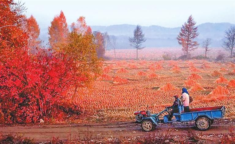 各個(gè)街口涌出的大車,宛若一條條歡快的溪流,或匯入主流奔向大道,或錯(cuò)肩而過進(jìn)入岔道。各家各戶的車把式,吆著喝著,比著拼著,迎著晨曦,向著自家豐收了的莊稼地奔去。