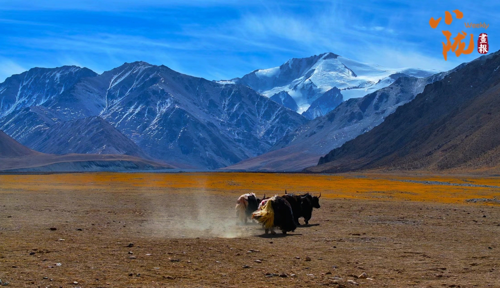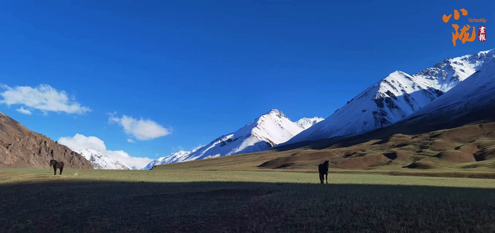 初秋,草香撲面而來(lái),綠草漸被秋風(fēng)染黃,與雪山、藍(lán)天繪成一幅層次鮮明的風(fēng)景畫(huà)。
