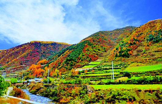 秋日的渭川大地,以非凡的姿態(tài)喚醒最美的山川河流,繪就一幅又一幅的秋日七彩山水畫卷。秋景中的龍臺鎮(zhèn),就是畫卷中最美的詩和遠方。秋葉隨風搖曳,村落掩映群林,溪水潺潺遠去,炊煙裊裊升起。在馬年云梯之上遙望太皇山巍峨雄壯,重巒疊嶂。由深紅、金黃、橙紅、翠綠交織在一起的秋日勝景,與藍天白云相映成趣,顯得壯麗無比。