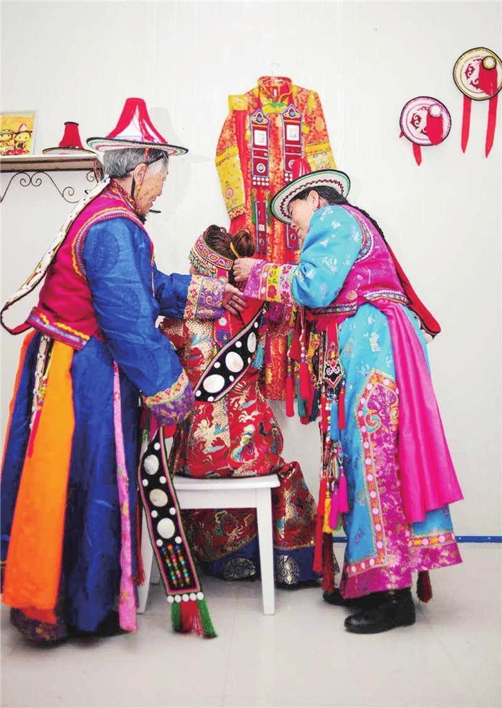 悠揚的歌聲中,即將出嫁的女孩,在兩位少婦的精心裝扮下,改變了發(fā)式,戴上喇叭形氈帽,佩戴上胸飾和背飾,戴上用銀牌、玉石、珊瑚、瑪瑙、海貝等編制成的頭面。
