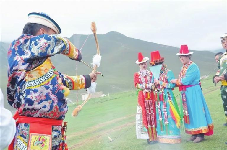 在迎親儀式上,新郎要向新娘連射三支沒有箭頭的箭,寓意新郎新娘相親相愛,白頭到老。
