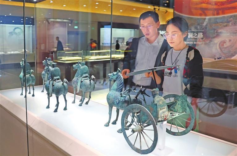 參觀(guān)者駐足欣賞絲綢之路文明展上的精美展品。