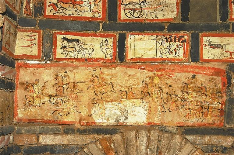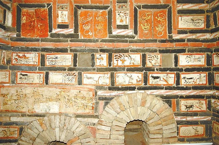 魏晉十六國磚畫在墓中的布局、組合,體現(xiàn)出 “滿”和“層”的特點(diǎn)。整個墓室,各方位、各邊角以及過道均鑲砌畫磚。以嘉峪關(guān)果園—新城5號墓畫磚的布局為例,各層間隔、同層緊鄰的畫磚,給觀者的感覺就是整幅壁畫,但每一塊又是一個獨(dú)立的畫面,這種“樣式”,是魏晉十六國時期的河西匠工、畫工,在繼承漢晉磚室墓的同時,將畫像磚在墓室布局的方式也加以接受。艷麗的色彩,“忠實(shí)”生活的寫實(shí)手法,又是河西畫匠們的創(chuàng)新和發(fā)揮。